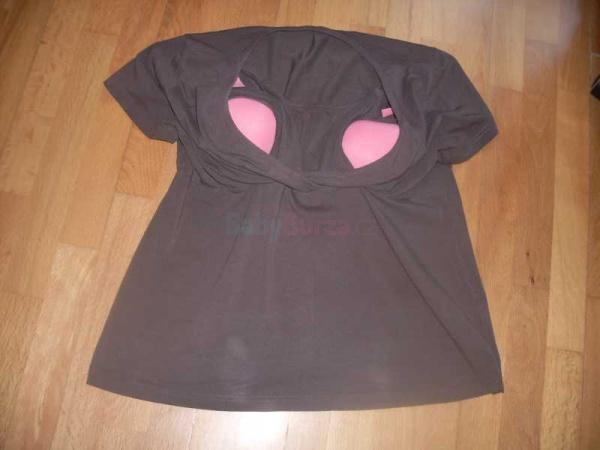 Těhotenské triko tunikového střihu, hnědé barvy, materiál bavlna s elastanem, kupované u Neckermanna, skvěle vypracované. Super uzpůsobené k nošení při kojení, díky skrytým průstřihům. Využitelné od začátku těhotenství po celou dobu kojení.